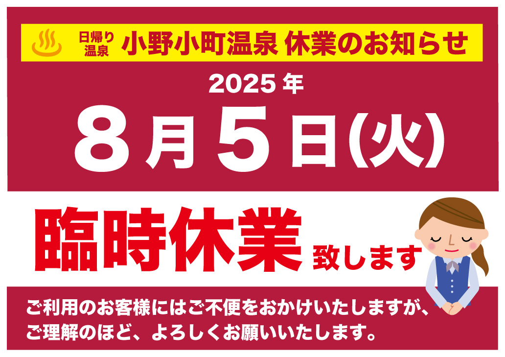 8月6日(水)・7日(木) 日帰り入浴の営業時間は16時(最終受付15時30分)まで