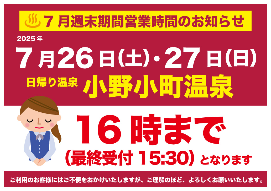 7月26日(土)27日(日) 日帰り入浴の営業時間は16時(最終受付15時30分)まで
