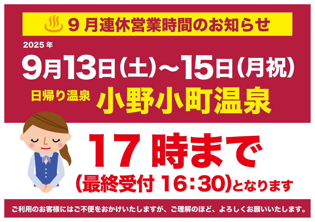 9月13日(土)~15日(月・祝) 日帰り入浴の営業時間は16時(最終受付15時30分)まで