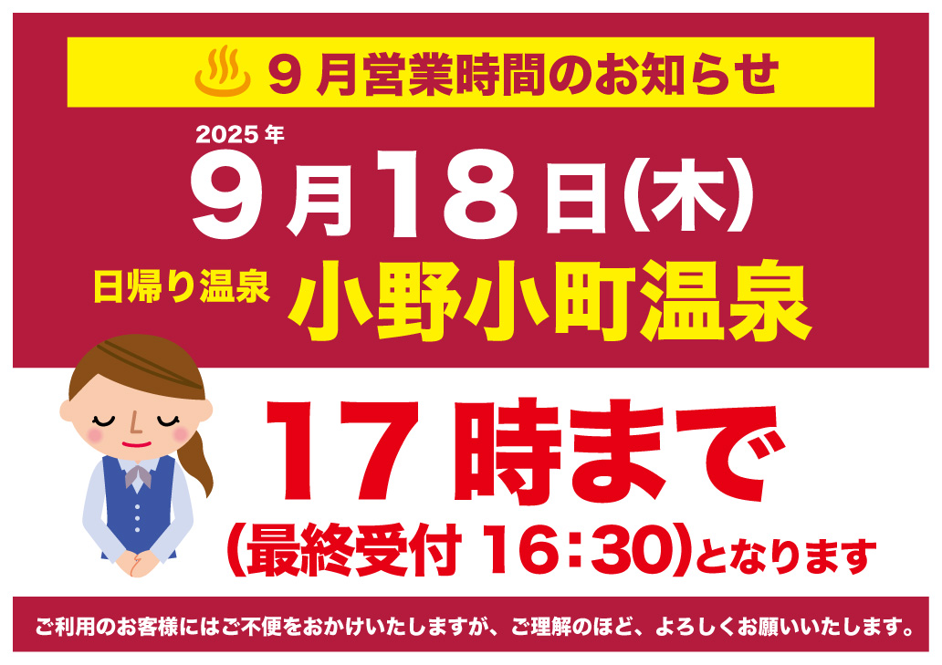 9月18日(木) 日帰り入浴の営業時間は17時(最終受付16時30分)まで