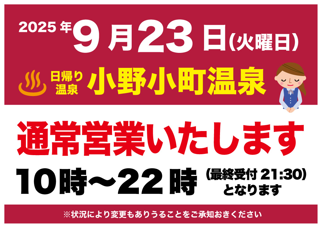 9月23日(火・祝) 10時~22時(最終受付21時30分)まで通常営業