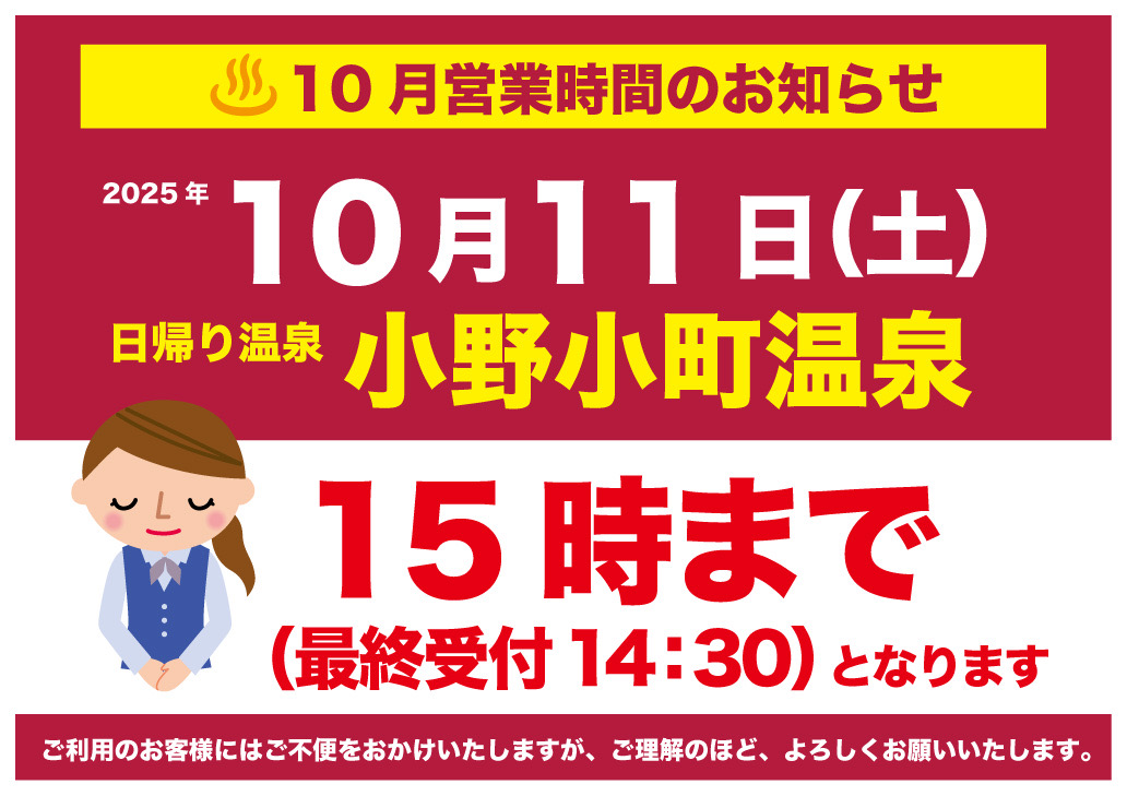 2025年10月11日(土)の日帰り入浴の営業時間は15時(最終受付14時30分)までとなります。