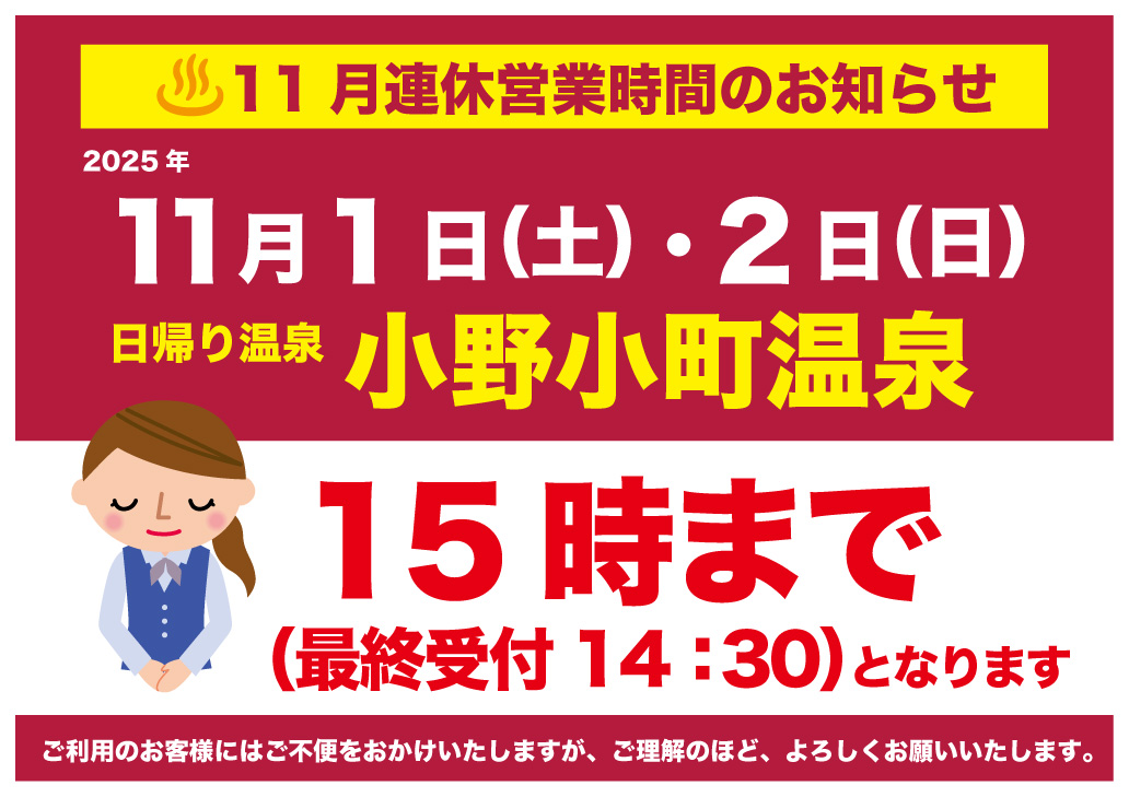 2025年11月1日(土)・2日(日)の日帰り入浴の営業時間は15時(最終受付14時30分)までとなります。