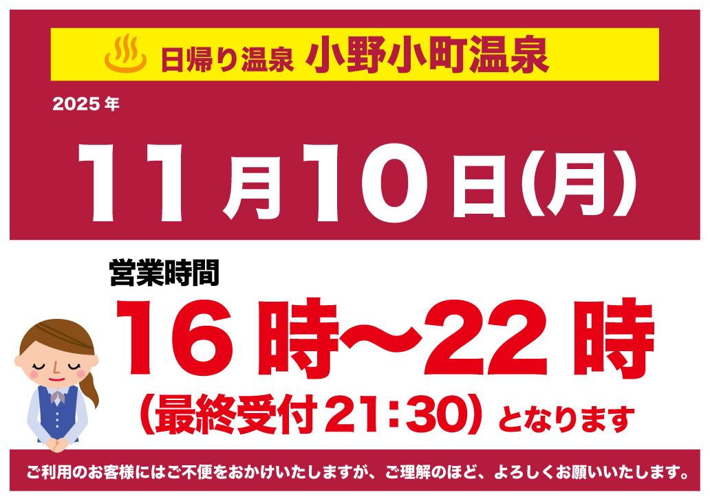 2025年11月10日(月)の日帰り入浴の営業時間は16時~22時(最終受付21時30分)となります。