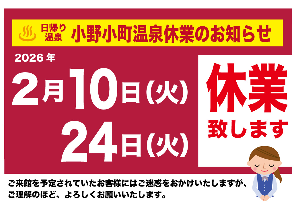 2026年2月10日(火)・24日(火)は、終日休業いたします。